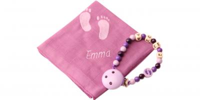 Grâce à ses nombreuses couleurs et au nom brodé (max: 10 symboles) votre doudou et votre attache-tétine seront unique!